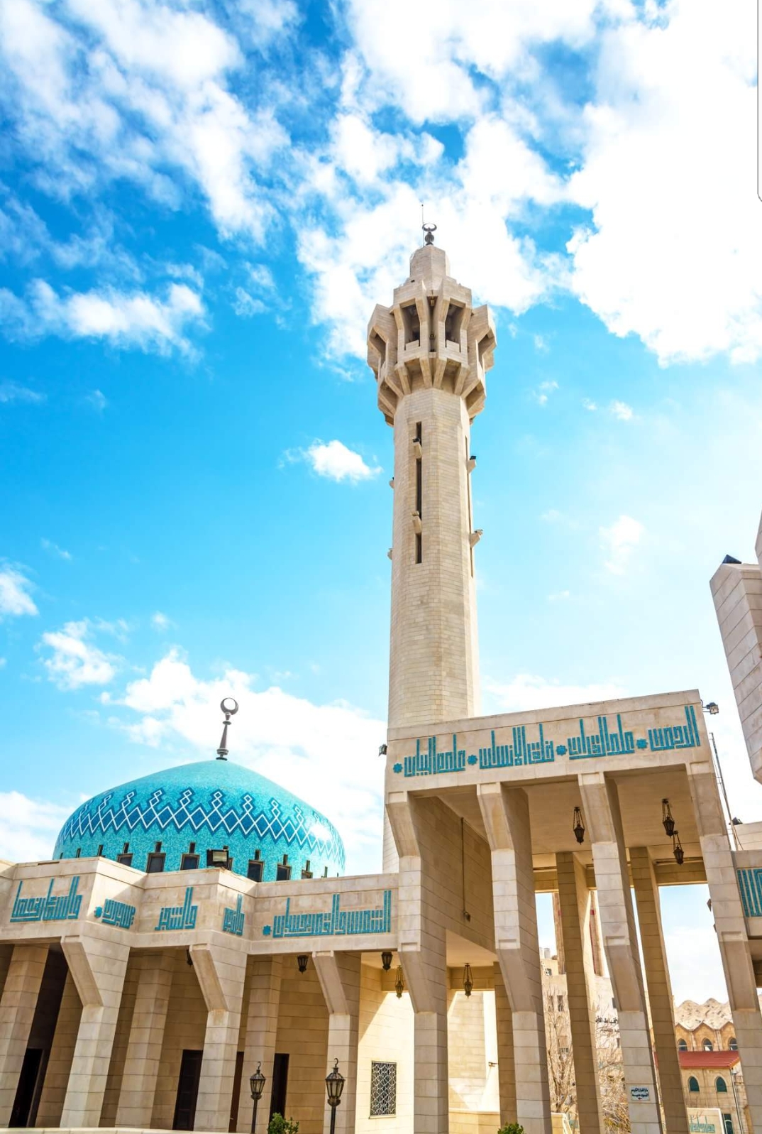 E as construções modernas como a Mesquita do Rei Abdullah destaca-se pelos mosaicos azul-turquesa que decoram sua cúpula.