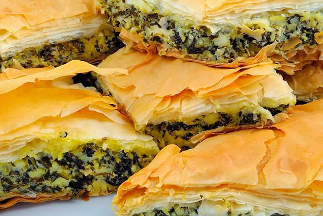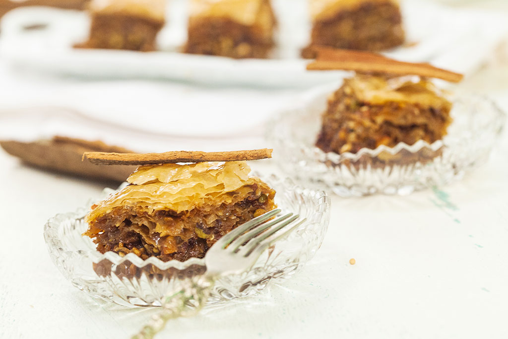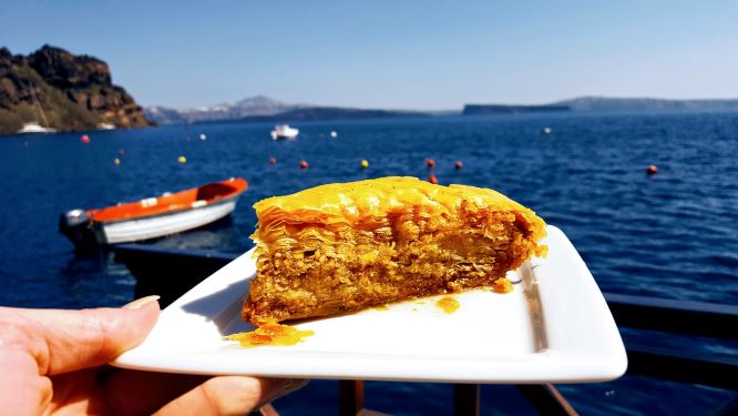 Baklava - é o típico doce grego pode-se encontrar em várias formas: massa folhada, tipo pastel ou envolvida em massa cabelo de anjo feita com uma pasta de nozes trituradas banhada em água de rosas ou mel, existindo variedades que incorporam pistache, avelãs e sementes de sésamo, papoila ou outros grãos.