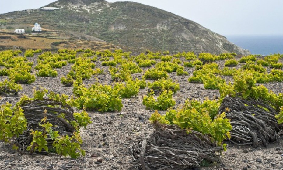 Por sua característica vulcânica, a ilha de Santorini tem uma forma peculiar de plantar as uvas. No lugar das parreiras, que são comuns na maioria das vinícolas pelo mundo afora, as uvas de Santorini são plantadas em espécies de ninhos grudados ao solo, para aproveitar o calor e os minerais vindos do terreno vulcânico.