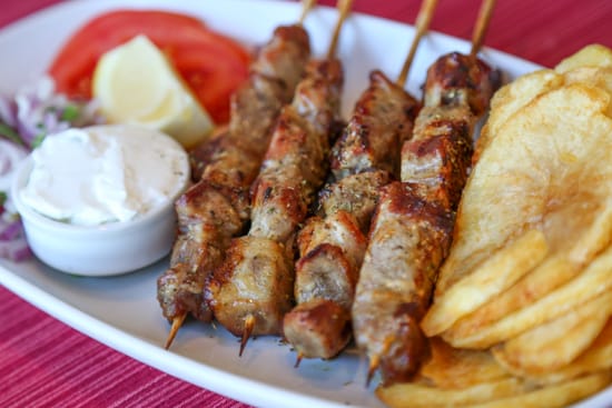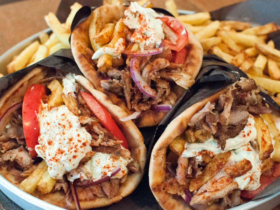 Souvlaki e Gyros - a versão grega para o fast food. Você acha para todos os lados. O Souvlaki é tipo um churrasquinho de frango ou porco, servido no prato ou no pão pita com molho, salada e batata frita. Já o Gyros é exatamente igual o tradicional kebab turco, com a diferença que eles também usam porco para aquela carne enorme que fica girando na vertical – aliás, o nome Gyros vem daí. Também vem no pita, com salada e molhos.
