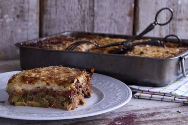 Moussaka - uma espécie de lasanha com camadas intercaladas de berinjela grelhada, molho bolonhesa (feito com carne de carneiro, cravo e canela), cobertos com bechamel temperado com noz moscada, gratinado ao forno.