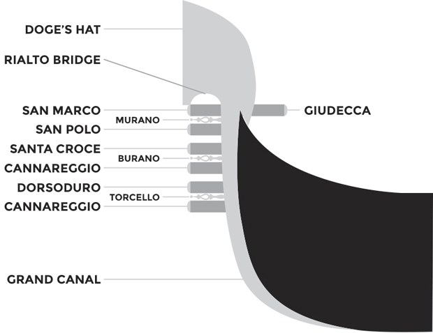 A ponta da gôndola tem um formato que lembra o chapéu do Duque, o primeiro magistrado e todo poderoso da República de Veneza. A ponta de ferro que inicialmente foi realizada para manter o equilíbrio da gôndola também representa os 6 sestieri ou seja, os bairros da cidade: San Marco, San Polo, Santa Croce, Castello, Dorsoduro e Cannaregio. A ponta representa o chapéu que usava o doge e logo abaixo dele está a Ponte de Rialto. Já a pontinha solitária do lado inverso representa a Giudecca, a pequena ilha separada do centro de Veneza.