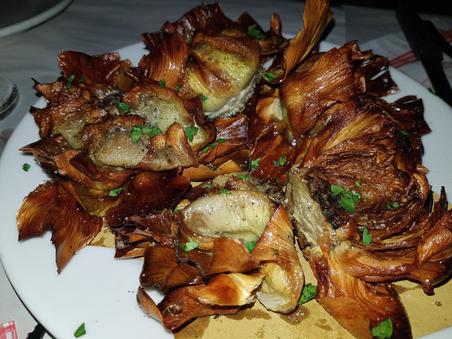 Comida típica da culinária judia. É simplesmente uma alcachofra frita no óleo de oliva e aberta como uma flor. O segredo é a fritura feita em duas e etapas e a alcachofra romana: um sabor único no mundo.
